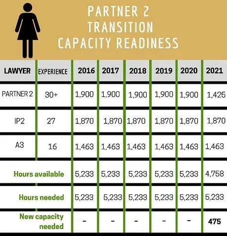 Covering the 475 hours that Partner2 plans to reduce in 2021 will require collaboration with the other partners who share resources with Partner2. The firm may have to absorb an underutilized lawyer during Partner2’s transition period (this may have compensation implications). Again, looking that far ahead is theoretical, but waiting until the retirement period begins is too late.